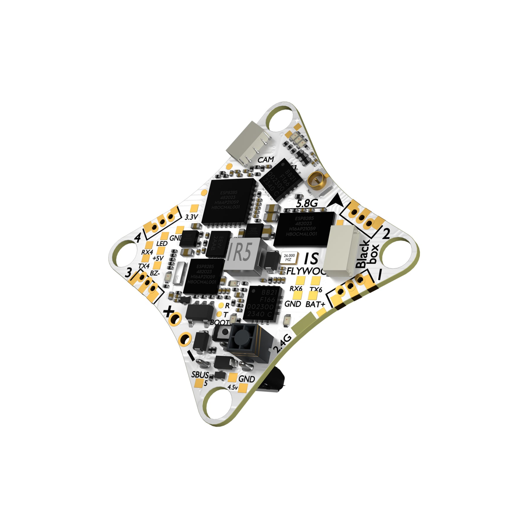 AIO FLYWOO GOKU F405 ERVT 1S 5A 5-in-1 400mw ELRS „Flywoo GOKU F405 ERVT 5-in-1 AIO“ yra itin kompaktiškas ir integruotas skrydžio valdiklis, skirtas 1S FPV dronams. Jis sukurtas naudojant galingą STM32F405BGA mikrovaldiklį ir aprūpintas ICM42688P giroskopu, kuris užtikrina greitą reakciją ir tikslų valdymą. Ši plokštė sujungia FC, 4-in-1 ESC (5A), ELRS imtuvą, 400 mW analoginį VTX ir OSD į vieną efektyvų įrenginį. Ji palaiko „Bluejay ESC“ programinę-aparatinę įrangą ir „DShot“ protokolus, kad užtikrintų sklandų veikimą. Su „plug-and-play“ jungtimis, JST1.25 variklio prievadais ir A30 akumuliatoriaus įvestimi, ji idealiai tinka mikrokonstrukcijoms. Ji suderinama su „Betaflight“ ir optimizuota lenktynininkams, kuriems reikalingas našumas ir komfortas. Skrydžio valdiklis: Mikrokontroleris: STM32F405BGA IMU: ICM42688P Ekrano meniu: AT7456E (LGA16) Juodoji dėžė: Ne (512 MB pasirinktinai) Barometras: Ne UART: UART1–6 (įskaitant ELRS RX, SBUS, juodąją dėžę, VTX) Protokolai: CRSF, SBUS, iBus, Spektrum BEC išvestis: 5 V, 2,0 A maks. FC programinė įranga: FLYWOOF405S_AIO Tvirtinimas: 25,5 x 25,5 mm (M2) Matmenys: 30,5 x 30,5 mm Svoris: 4 g ESC: Įėjimo įtampa: tik 1S Nuolatinė srovė: 5 A Didžiausia srovė: 8 A Programinė įranga: „Bluejay O_H_5_48KHz_V0.19.hex“ Signalo protokolai: DShot300, DShot600 Variklio jungtys: JST1.25 Akumuliatoriaus jungtis: A30 Vaizdo siųstuvas (VTX): Galia: 25 / 50 / 100 / 200 / 400 / 0 mW Dažnis: 5,8 GHz, 40 kanalų Protokolas: IRC Tramp Lenktynių dažnių juosta: 5658–5917 MHz Vėlavimas: mažiau nei 50 ms (optimizuota 1S) Antena: integruota pagoda Darbinė temperatūra: nuo -15 °C iki +80 °C Pakuotėje yra: 1 × GOKU F405 ERVT 1S 5A 5 viename AIO kompiuteris 1 x A30 maitinimo laidas 1 × 3 kontaktų 50 mm kameros kabelis JST-0.8 1 x „Flywoo Blackbox“ jungiamasis kabelis 4 x 1,25 mm 3 kontaktų vertikalus tiesus lizdas 4 × M2x6,6 slopinimo rutuliai